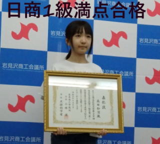 日商統一検定1級満点合格 岩見沢商工会議所で表彰 高田 紗羽 |